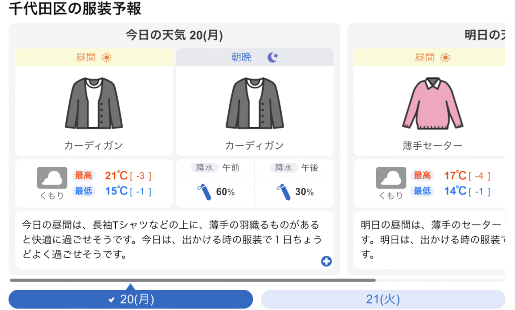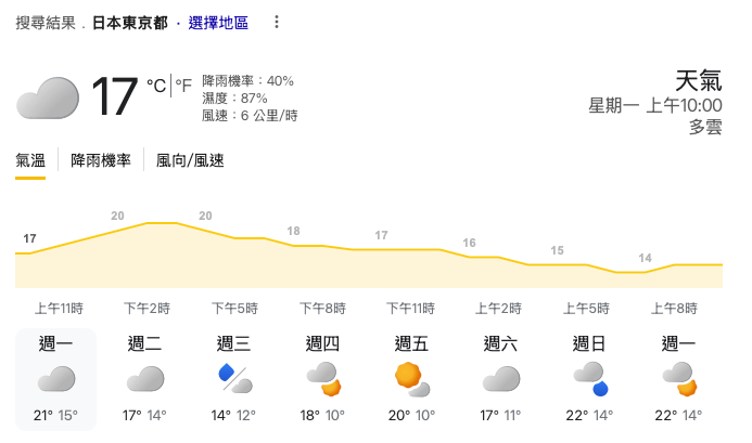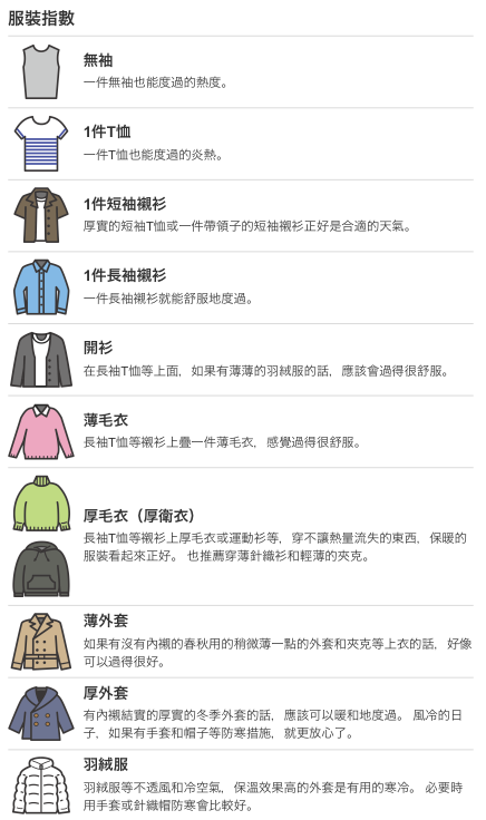 雖然這個預報應該是自動生成,而不經人手調整,卻能夠把數字,直接轉換成各種服裝,去日本該怎麼穿就比較好懂了,所以還是有一定的參考價值的。