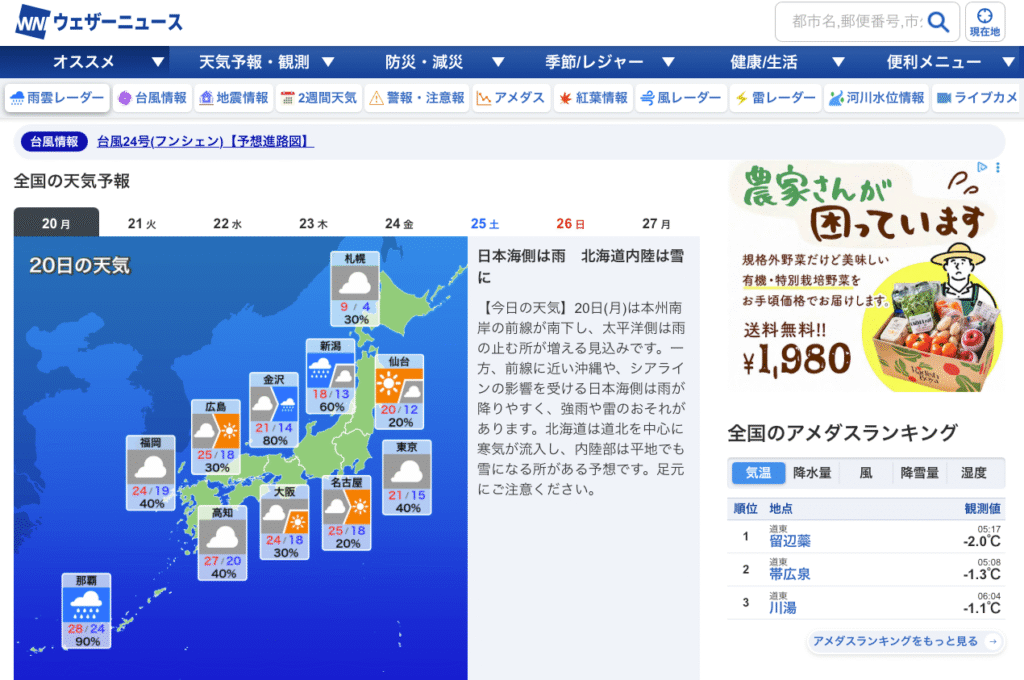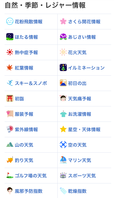 日本天氣新聞網站 (Weather News / WNN),除了提供一般天氣預報,還推出了各種各樣跟天氣相關,例如紅葉、櫻花、花粉、洗衣服、滑雪等等的預報。