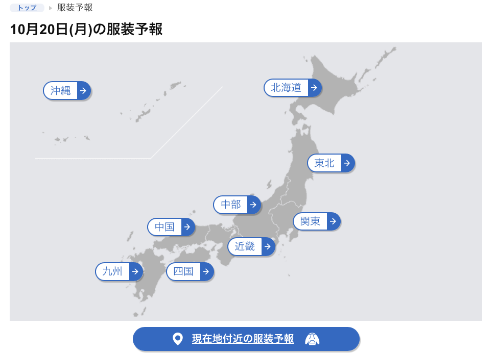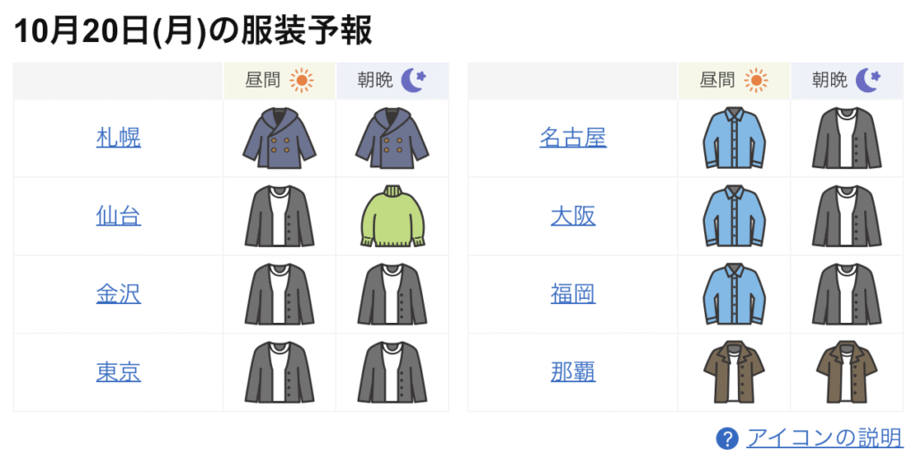 點進去,就會看到當天的服裝預報地圖了。 往下拉,就會看到札幌、名古屋等主要城市。